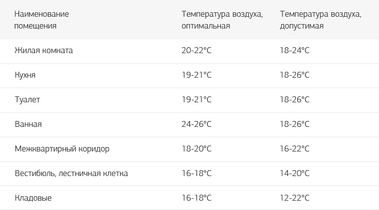 В жилых домах минимумом температуры в комнатах считается +18 градусов, а в детских садах и больницах он равен +21 градусу. Тепло в помещении зависит ещё и от температуры на улице, а также нужно учитывать потерю тепла и от вентиляции, через ограждающие конструкции.