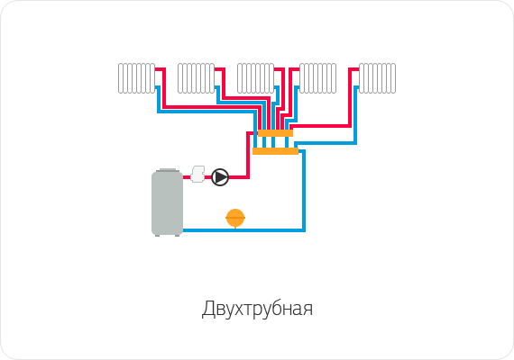 Двухтрубная система отопления отличается более сложной архитектурой, а ее монтаж требует большого количества материалов. И, тем не менее, данная система является более востребованной, чем простая однотрубная система отопления. Двухтрубная система отопления являет собой два замкнутых контура, один из которых служит для подачи нагретого теплоносителя к радиаторам, а второй – для оттока уже отработанной (остывшей) жидкости. Двухконтурная система отопления имеет весомое преимущество перед однотрубной, в которой нагретый теплоноситель теряет часть тепла еще до того, как достигнет радиаторов.