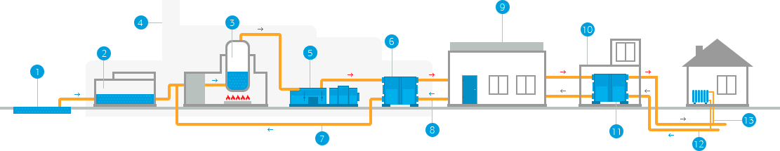 Схема работы ТЭЦ и переноса тепловой энергии к потребителям