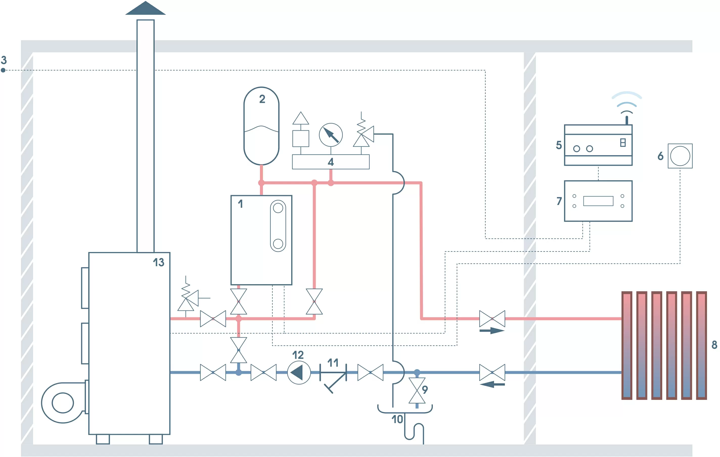 В состав котла входит датчик комнатной температуры. Управление по комнатной температуре повышает экономичность котла и создает комфортные условия в помещении.