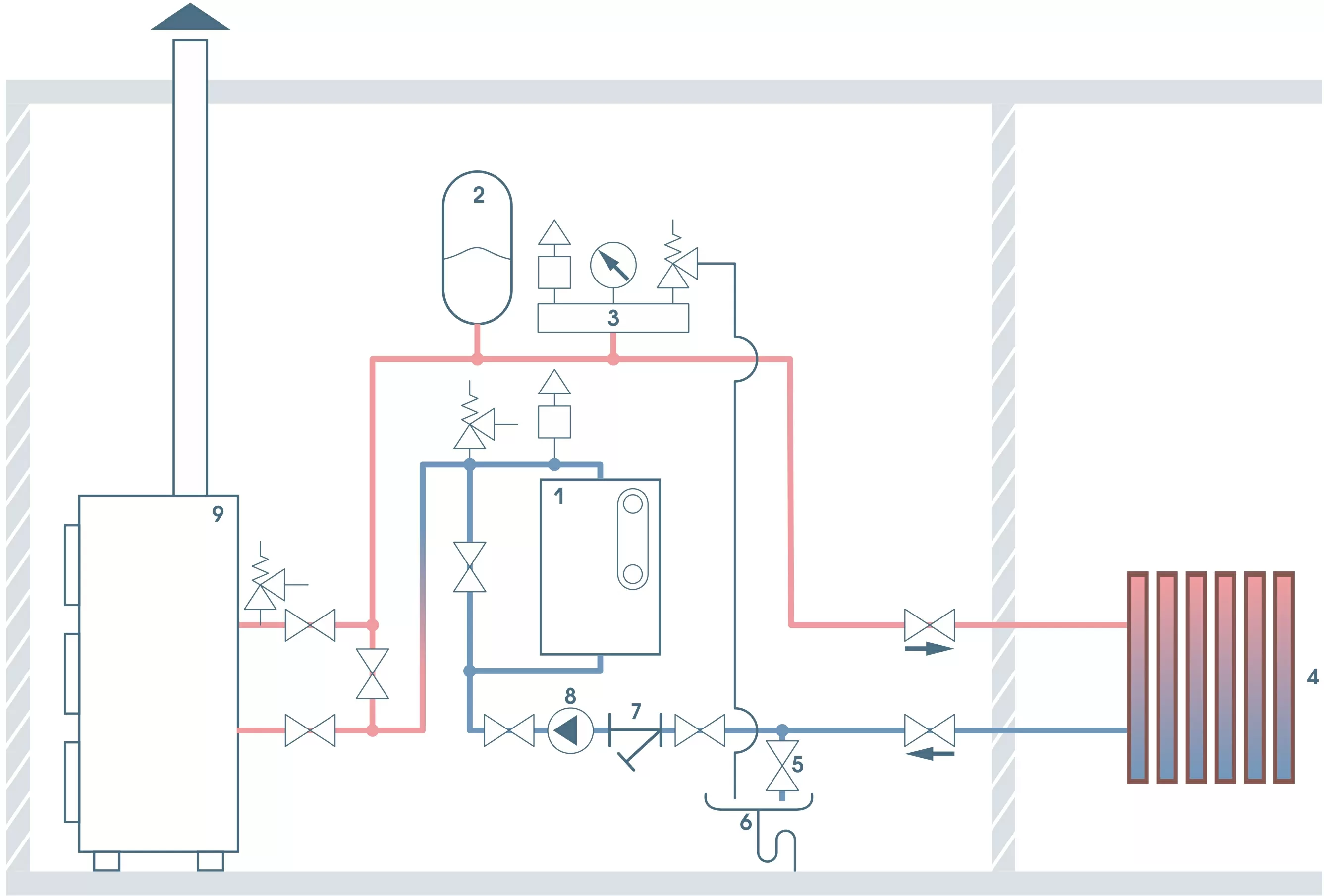 Принцип работы системы отопления достаточно прост: Насос создает циркуляцию теплоносителя в системе отопления, теплоноситель нагревается в котле, а затем постепенно остывает в трубах и радиаторах, излучая тепло и нагревая помещение. Остывший теплоноситель снова поступает по трубопроводам в котел. В систему отопления также входят краны, вентили, и другая трубопроводная арматура.