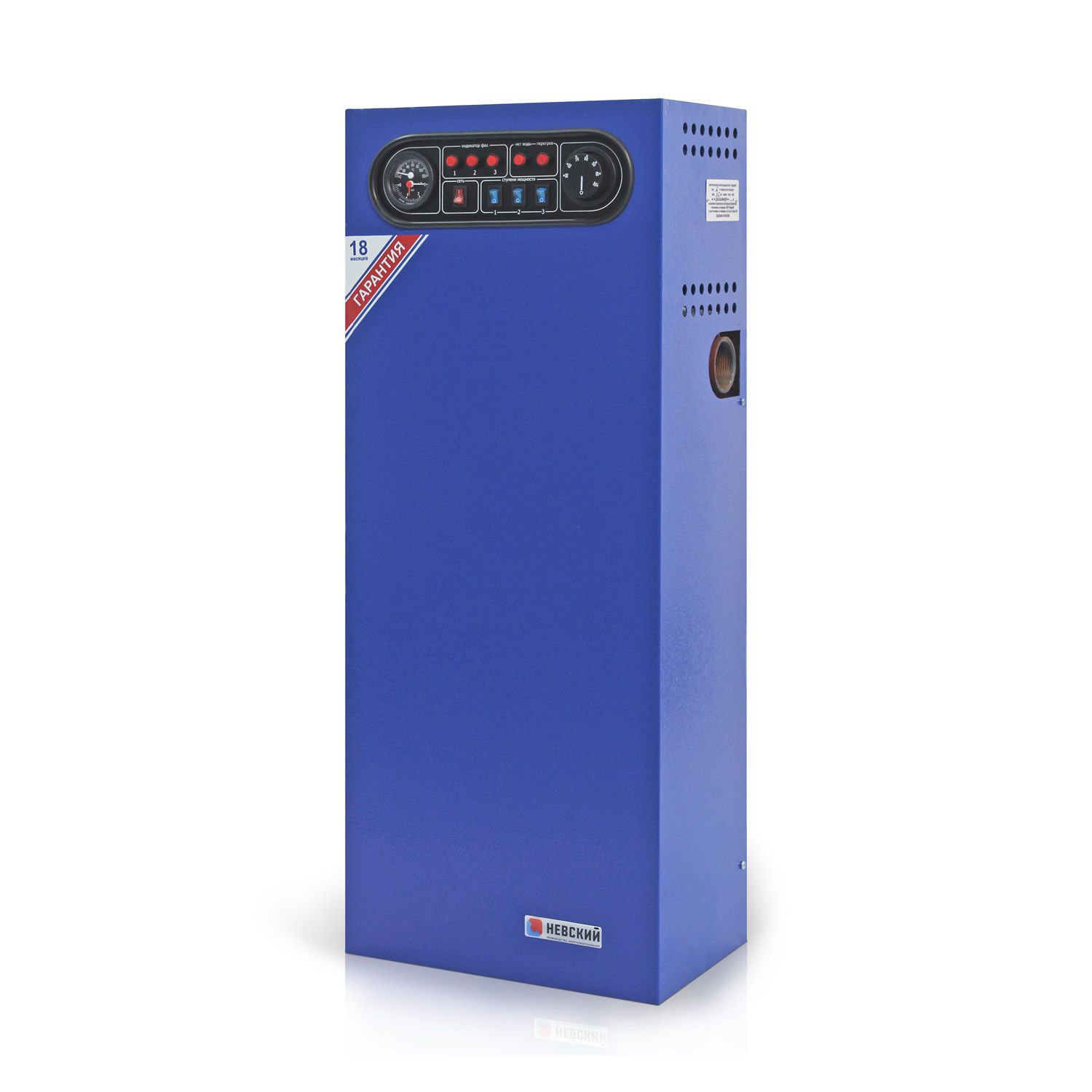 Монтируется на стене, занимает мало места и не требует отдельного помещения для размещения, имеет встроенный термоманометр. Котел имеет каскадное включение ступеней, контролирует наличие теплоносителя, входное напряжение, имеется возможность подключения дополнительного реле протока и термостата-программатора.